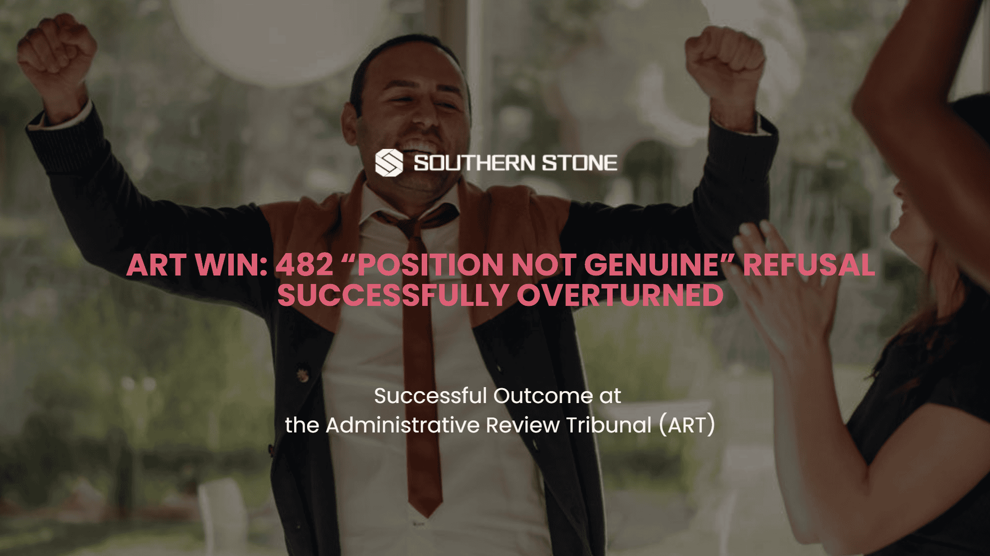 We’re pleased to share another successful outcome at the Administrative Review Tribunal (ART). This case involved the refusal of a Subclass 482 nomination, where the position was assessed as “not genuine” — one of the most common and challenging grounds for refusal in employer-sponsored visa applications. Following review, the Tribunal set aside the original… Continue reading ART Win: 482 “Position Not Genuine” Refusal Successfully Overturned