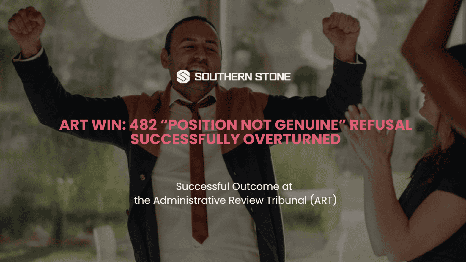 We’re pleased to share another successful outcome at the Administrative Review Tribunal (ART). This case involved the refusal of a Subclass 482 nomination, where the position was assessed as “not genuine” — one of the most common and challenging grounds for refusal in employer-sponsored visa applications. Following review, the Tribunal set aside the original… Continue reading ART Win: 482 “Position Not Genuine” Refusal Successfully Overturned